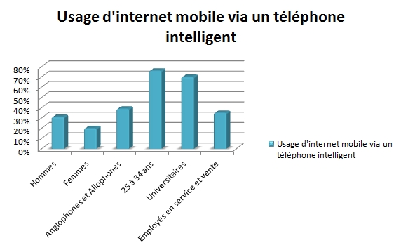 Certains groupes sont significativement plus susceptibles que d’autres d’accéder à Internet mobile au moyen de leur téléphone mobile. Sur les téléphones cellulaires, les hommes sont plus susceptibles d’en faire usage que les femmes. C’est aussi le cas des anglophones et des allophones, ainsi que des employés du secteur des services, de bureau et de la vente. Sur les téléphones intelligents, les Québécois de 25 à 34 ans ainsi que les universitaires sont proportionnellement plus nombreux à faire usage d’Internet au moyen de cet appareil.