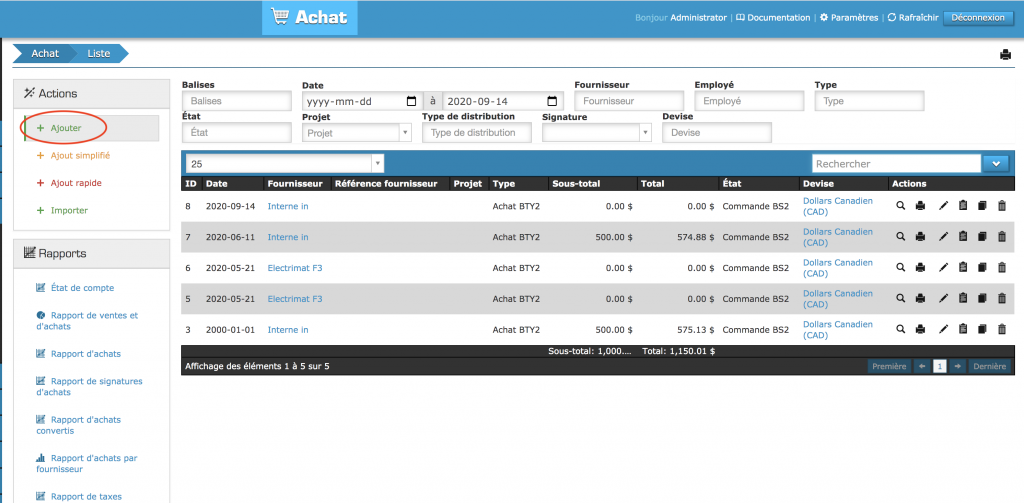 Vous êtes maintenant sur la page des achats. Afin d’ajouter un nouvel achat, cliquez sur « Ajouter un achat » situé dans la boîte d’action.