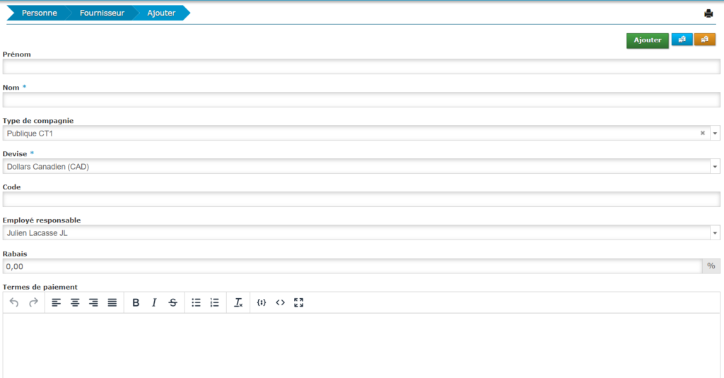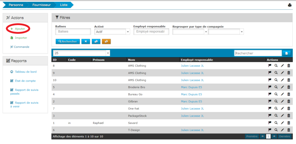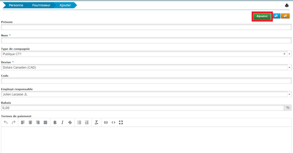 À partir de la page des fournisseurs, cliquez sur «Ajouter». Cette fonctionnalité est située dans la boîte à action rapide.