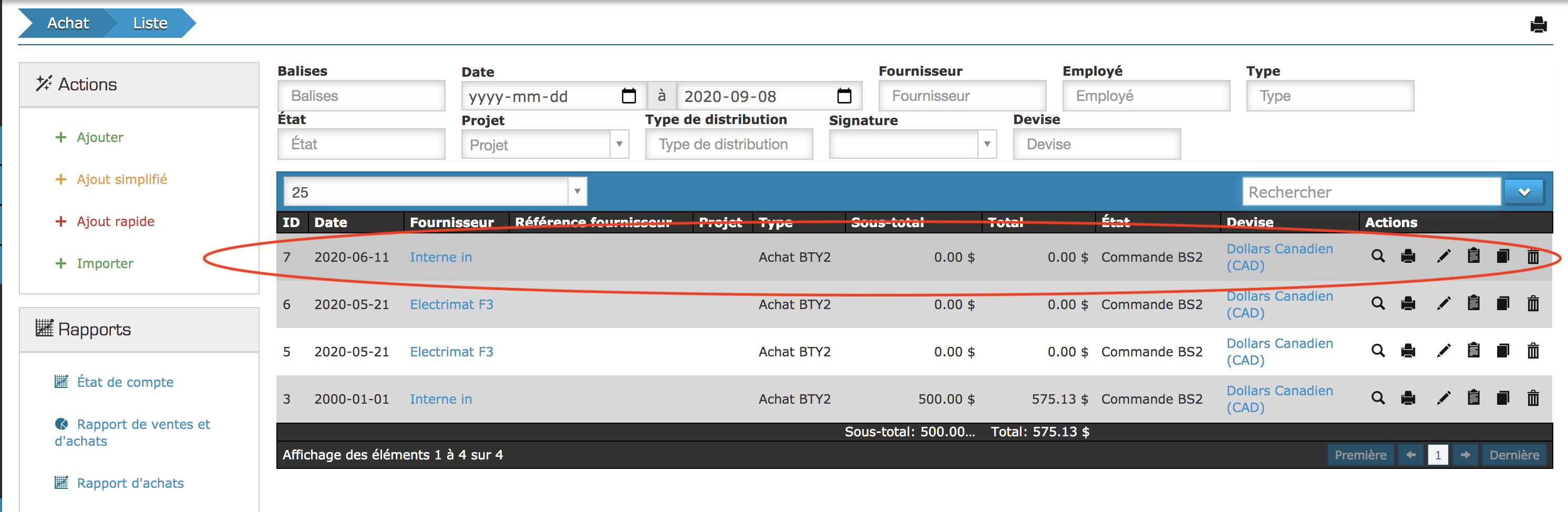 2 ) Une fois arrivé sur la page des achats, sélectionnez l’achat que vous désirez ajouter une ligne.