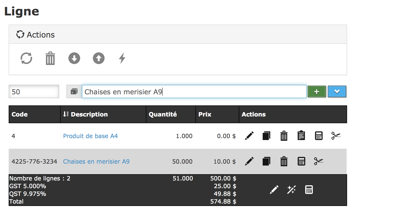 L’ajout de ligne à un achat permet d’ajouter rapidement des lignes simplement en entrant le nom du produit ainsi que la quantité. Les totaux se calculent automatiquement.