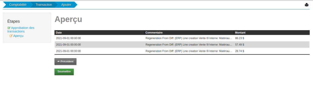 Les transactions attendues sont celles que génère le système automatiquement en fonction de vos données existantes (voir générateur de transactions comptables).