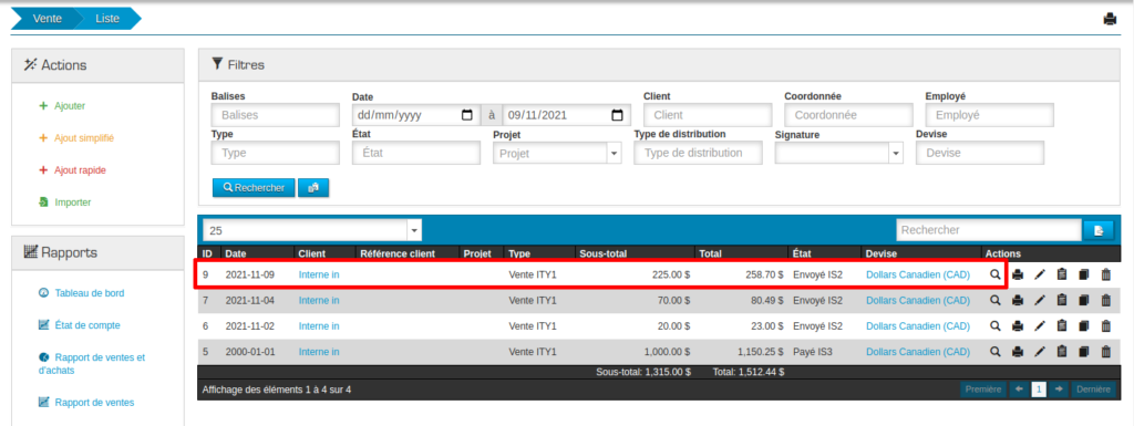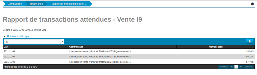 À partir de la page de détails d’une ressource comptabilisable (par exemple, Vente), aller au bas de la page dans la section « Système » et cliquer sur le bouton « Transactions attendues de la ressource ». Il peut aussi être possible d’utiliser l’action « Transactions attendues de la ressource avec relation » pour voir aussi les transactions attendues des ressources en relation (par exemple, dans le cas d’une vente, pour voir les transactions attendues de la vente et des ses paiements).