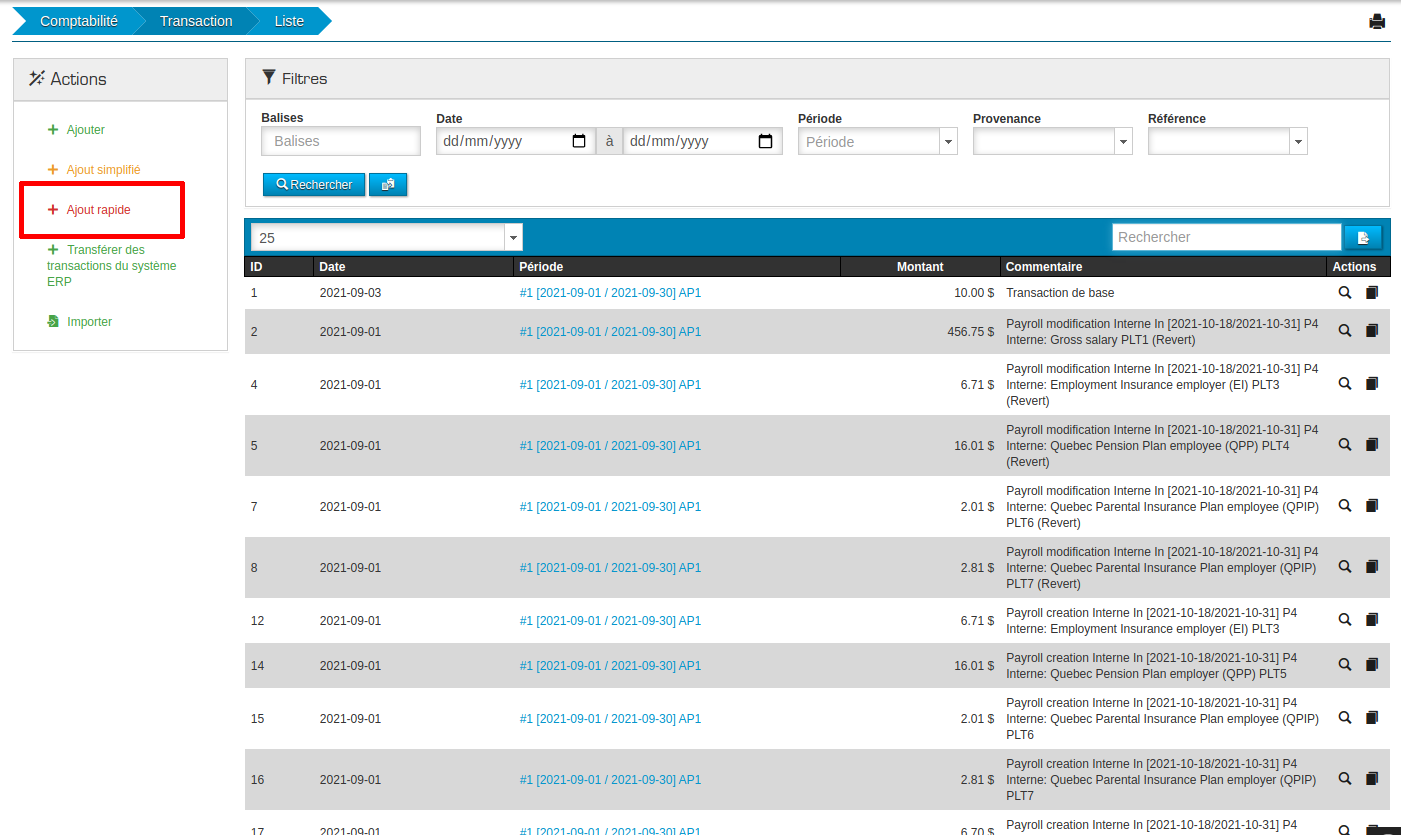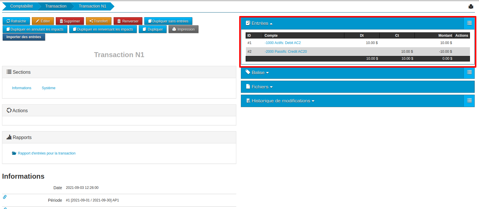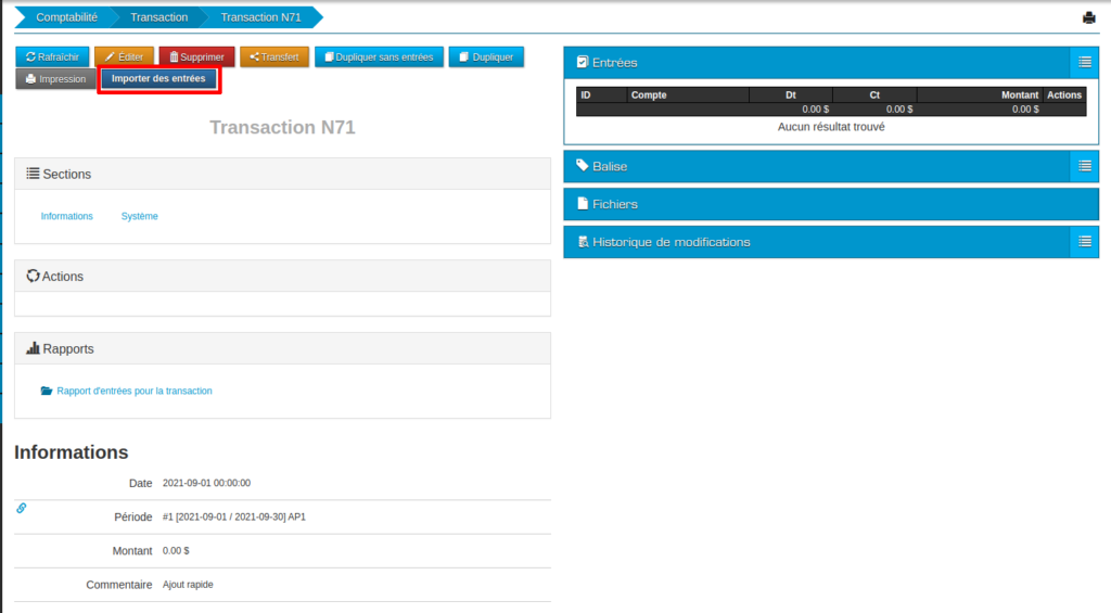6) Étape la plus importante, valider que la transaction balance! Le système ne fera pas la vérification lors de l’import, vous êtes responsable de la validité des informations dans votre fichier d’import. Pour facilement faire la validation, simplement aller dans la page de détail de la transaction, puis regarder le montant total dans la boîte d’entrées. Le total devrait être de 0$.