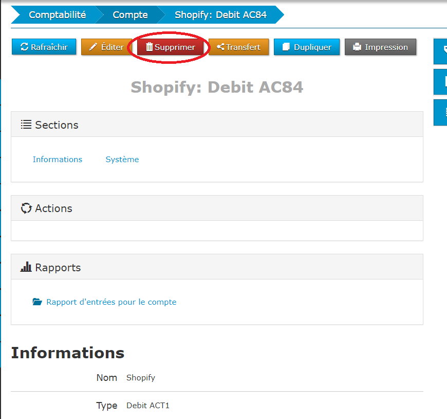 À partir de la page du compte à supprimer, cliquez sur le bouton « Supprimer », situé au haut de la page.