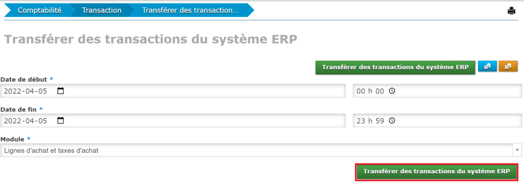 Une fois que vous avez complété les informations, cliquez sur « Transférer des transactions du système ERP »