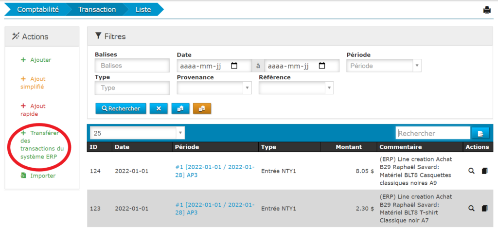 À partir de la page des transactions, cliquez sur le bouton « Transférer des transactions du système ERP ». Celui-ci est situé dans la boîte d’action rapide.