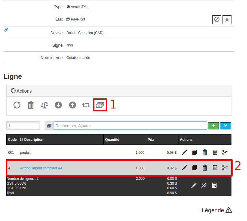 - On peut voir sur l’image la ligne qui a été créée par l’arrondissement pour ajuster le total de la vente.