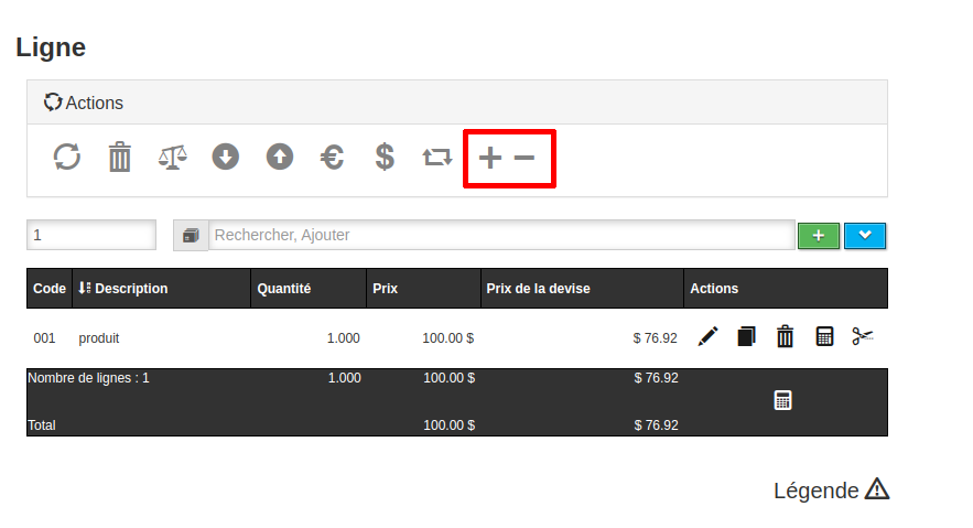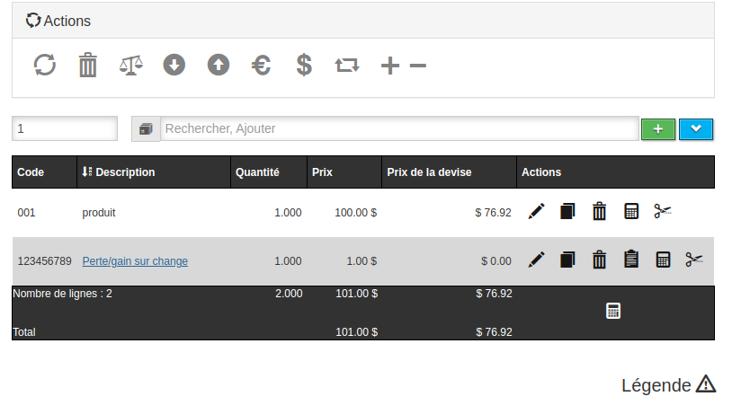 La fonctionnalité se trouve dans les actions de lignes dans une vente. Pour qu’elle soit visible, la vente doit être dans une devise qui n’est pas celle par défaut dans le système et avoir un taux différent de 1. De plus, une clé valeur doit être ajoutée pour configurer le produit à utiliser lors de la création de la ligne de perte/gain. La fonctionnalité se trouve au même endroit dans les achats, avec les mêmes conditions pour qu’elle soit visible.