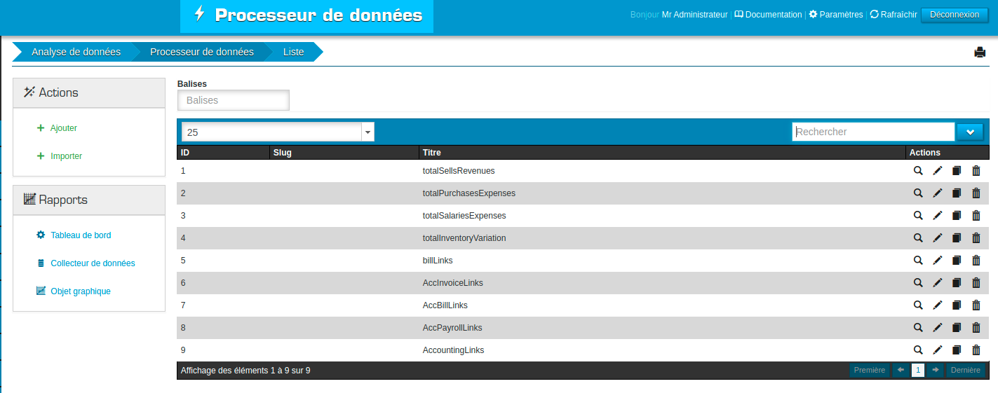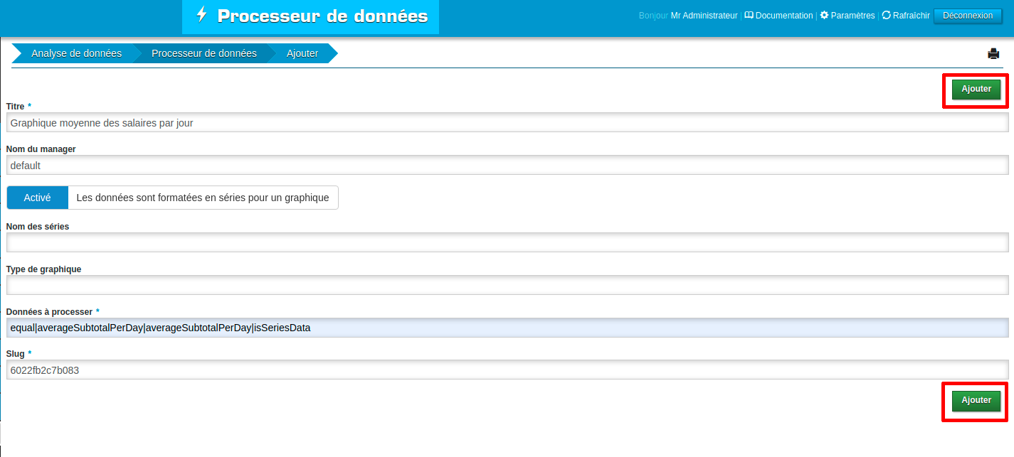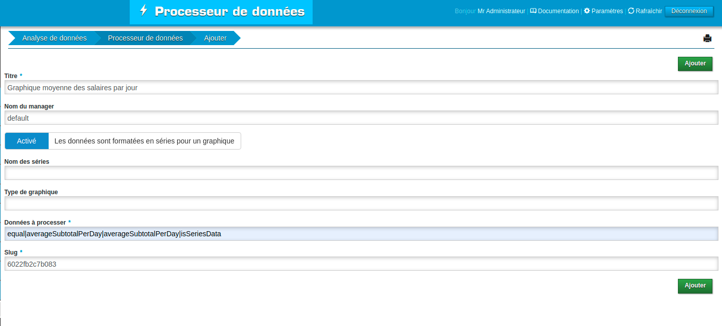 Slug: Slug unique généré aléatoirement, il est possible de le modifier pour le remplacer par un autre slug, à condition que ce soit unique (qu’aucun autre processeur de données ne possède le même slug).