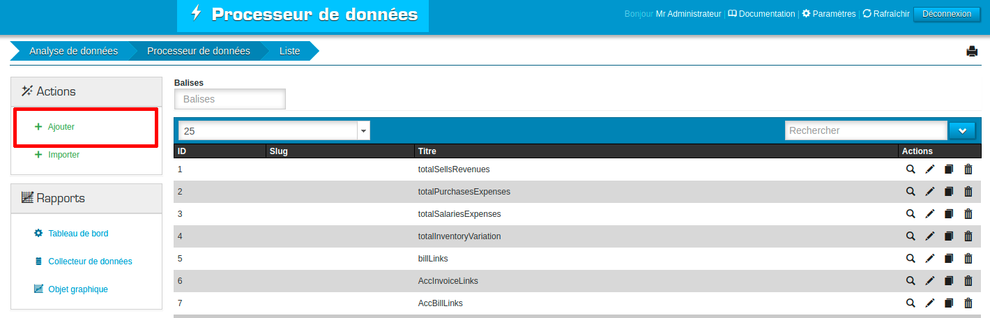 Vous devriez maintenant être dans l’affichage de la liste des Processeurs de données.