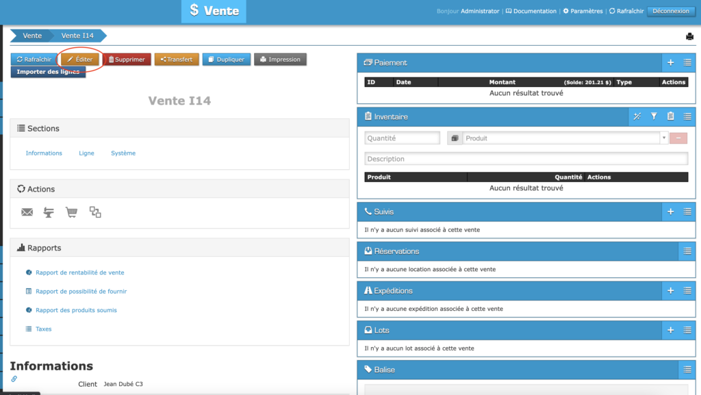 Il se peut que vous ayez besoin d’apporter certaines modifications à une vente enregistrée dans le logiciel PHPReaction. Pour modifier les informations concernant le client, la date, ou autre, suivez les étapes ci-dessous. Pour apprendre à modifier une ligne de vente, cliquez ici.