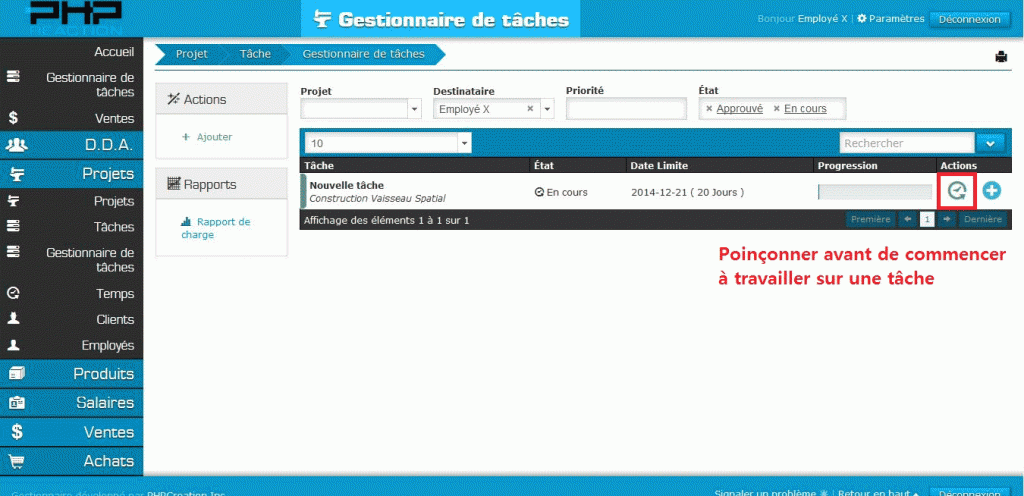 Voici les étapes à suivre afin d’enregistrer son temps en début de journée dans le logiciel PHPReaction à la manière d’une feuille de temps :