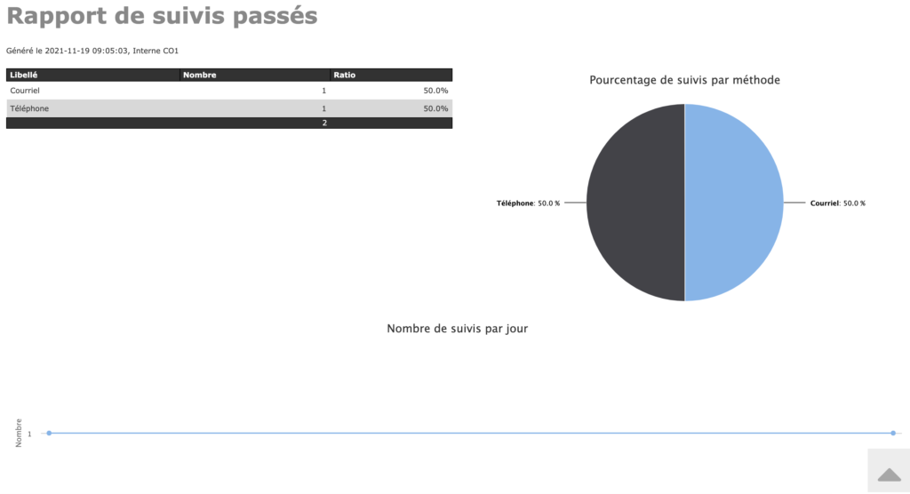 Le rapport des suivis passés est un outil qui permet aux utilisateurs du logiciel PHPReaction de consulter tous les suivis qui ont été effectués dans le passé. Le rapport affiche une liste de tous les suivis, un tableau analytique (nombre de suivis et méthode de suivi – téléphone, courriel, etc.), un histogramme, ainsi qu’un diagramme circulaire (répartition entre les types de suivis).