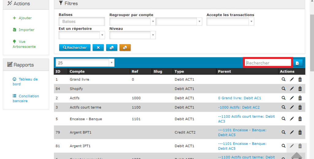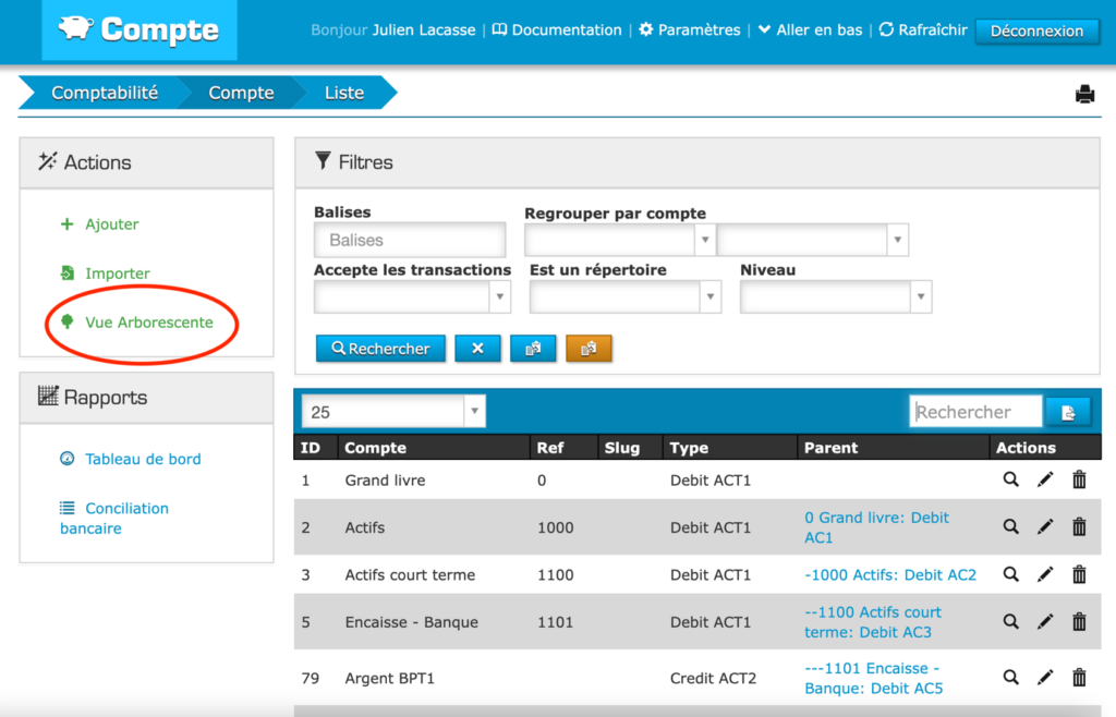 Vous pouvez simplifier votre lecture en cliquant sur « Vue arborescente ». Cette fonctionnalité vous permet d’avoir une vision plus claire de tous les comptes du grand livre.