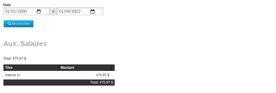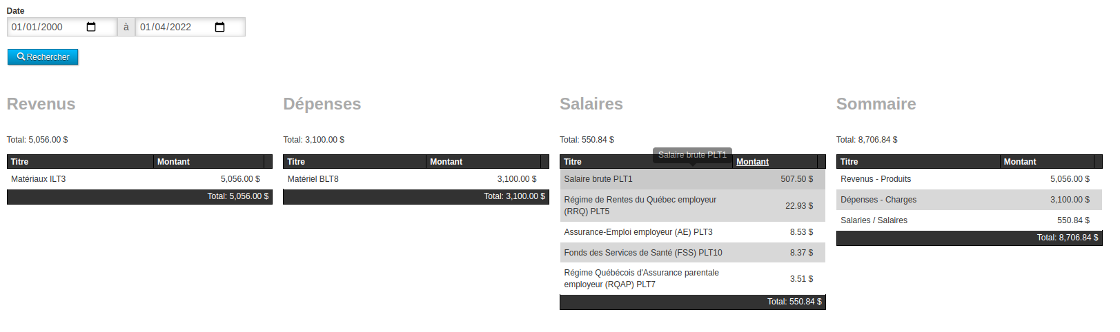 Dans l’État des résultats, il y a le sommaire des revenus, le sommaire des dépenses, un sommaire des salaires, ainsi qu’un sommaire avec les totaux de chacun des sommaires. Comme dans les auxiliaires, les comptes avec une somme des entrées à 0 ne sont pas affichés.