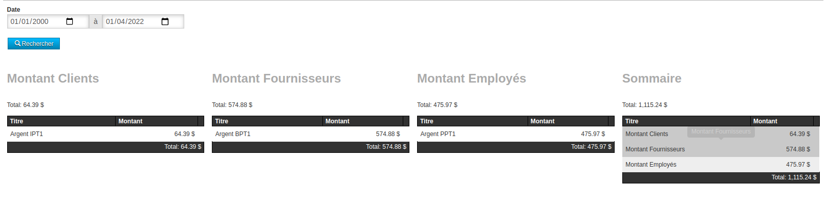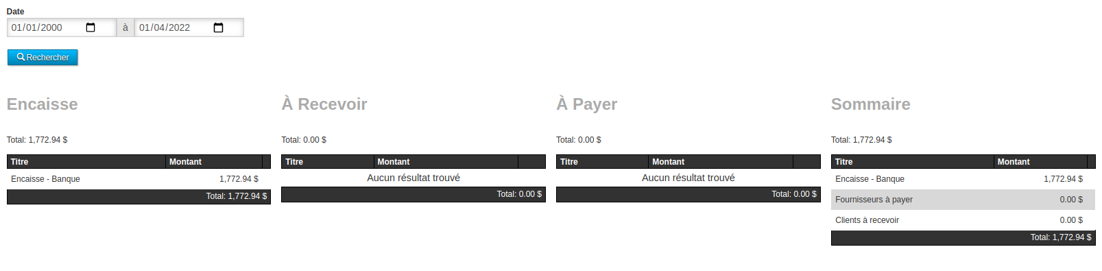Dans la trésorie, il y a le sommaire d’encaisse, le sommaire de tous les comptes « à payer », un sommaire de tous les comptes « à recevoir », ainsi qu’un sommaire avec les totaux de chacun des sommaires. Comme dans les auxiliaires, les comptes avec une somme des entrées à 0 ne sont pas affichés.