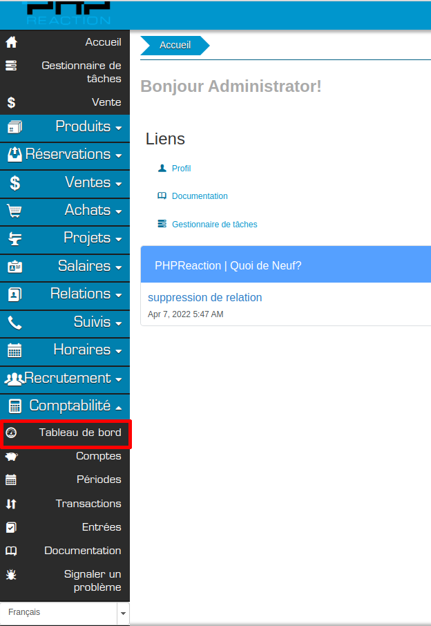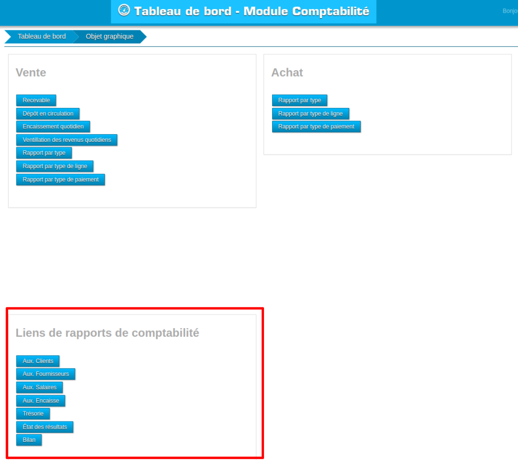 Les liens vers les rapports se trouvent dans la page « Tableau de bord de Comptabilié », dans la section « Liens de rapports de comptabilité ».
