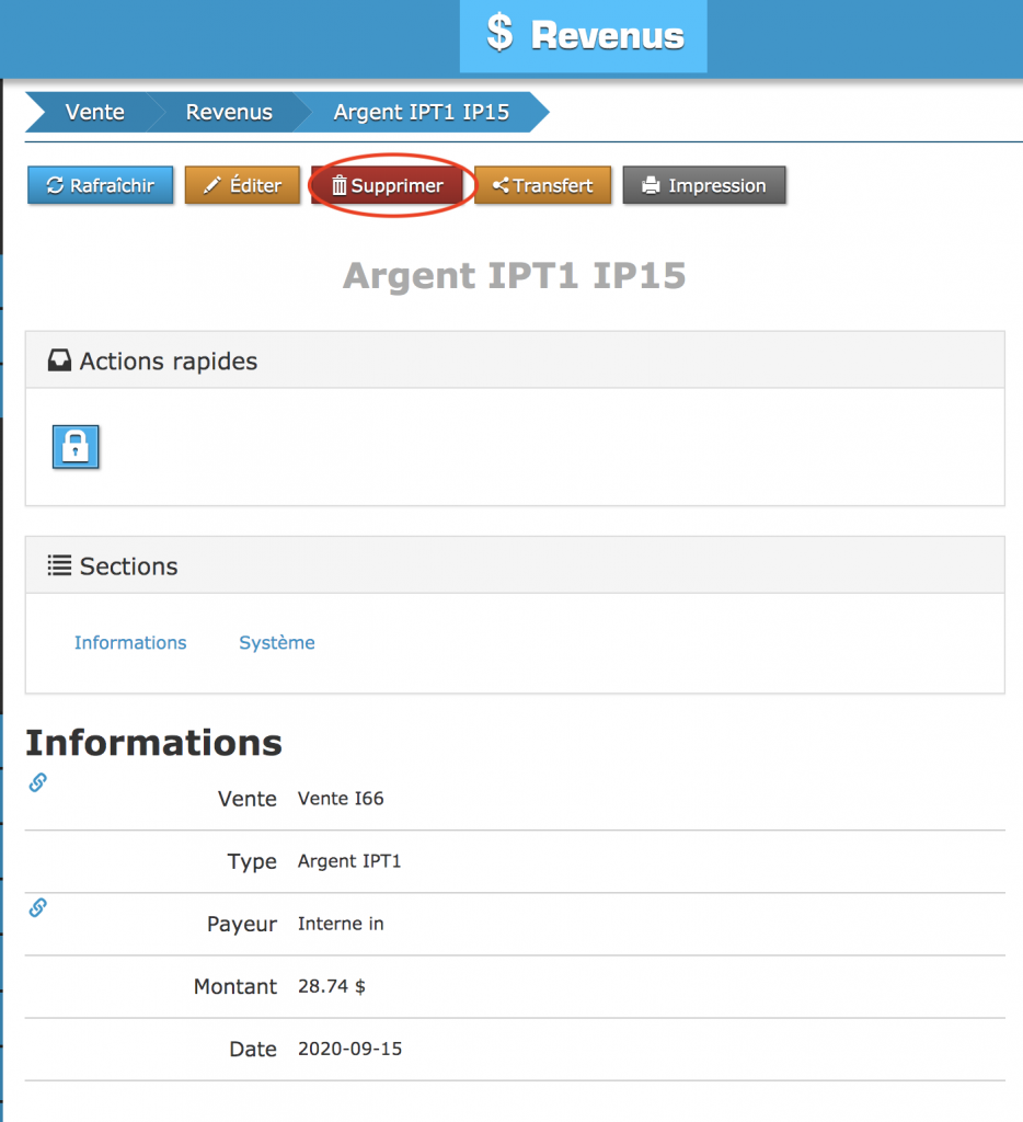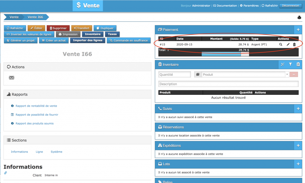 Pour cet exemple, vous désirez supprimer le paiement. Pour ce faire, cliquez sur la ligne de paiement située sur la page de votre vente.