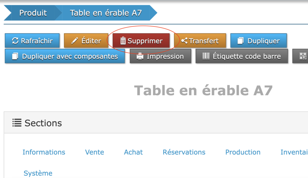 Le système ERP est conçu pour lier les données les unes entre les autres. En d’autres mots, si un produit est lié à des achats et ventes , vous aurez le choix entre supprimer les opérations ou les déplacer vers un autre produit pour les conserver.