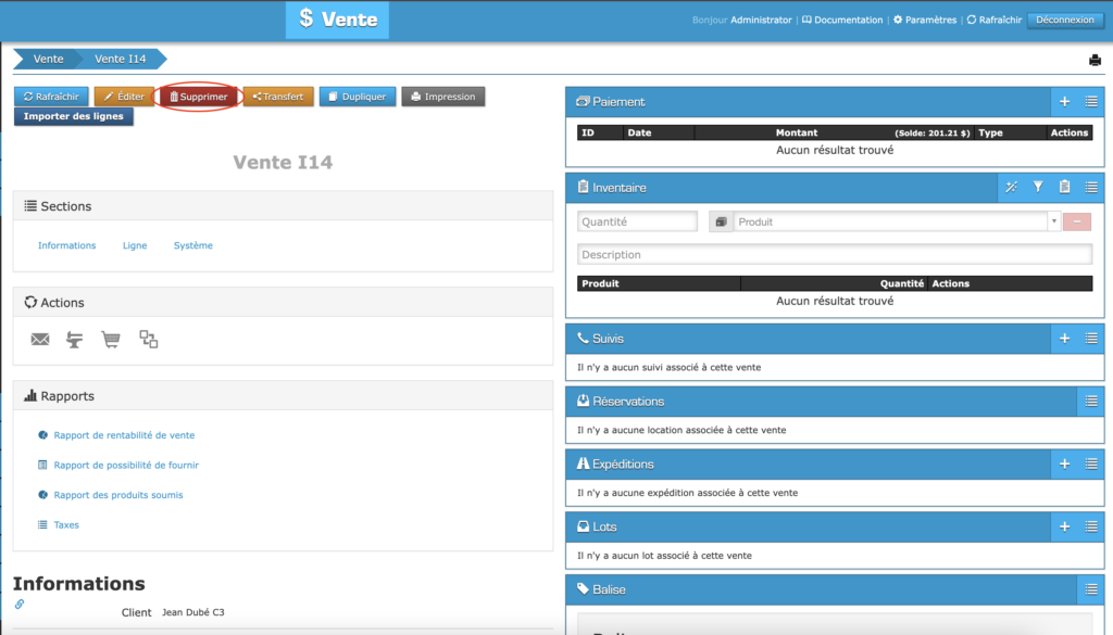Lorsque la vente s’affichera à l’écran, cliquez sur le bouton « Supprimer ».
