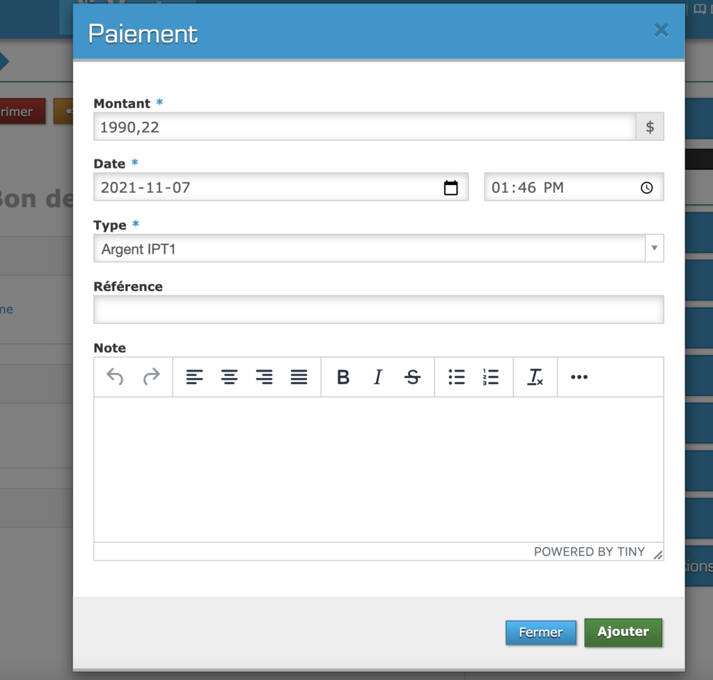 Lorsque vous aurez complété l’étape ultérieure, le logiciel PHPReaction affichera une boîte d’ajout d’un paiement. Complétez les informations du paiement en question. Lorsque vous aurez terminé, cliquez sur « Ajouter ».