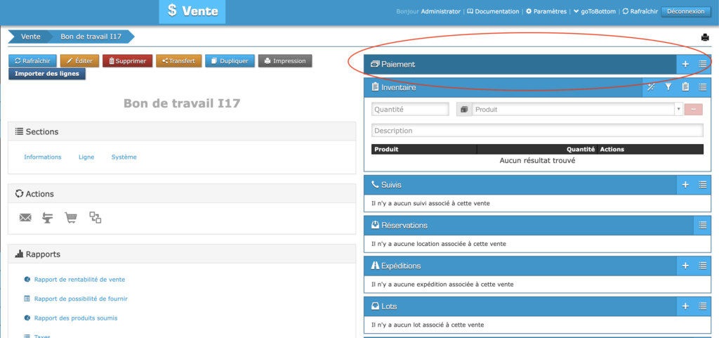 Lorsque la vente s’affichera à l’écran, cliquez sur la boîte bleue « Paiement » qui se trouve à la droite de la page.