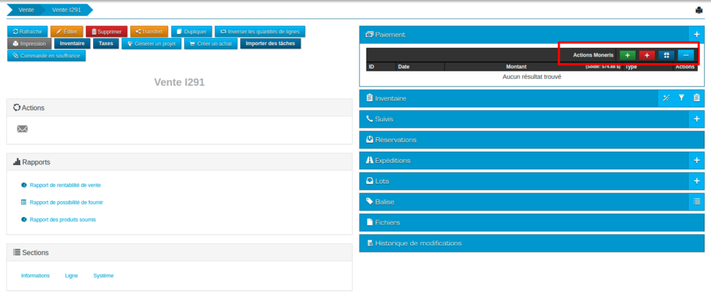 Étape #3 : Une fois sur la vente, remarquez les 4 nouvelles icônes de couleurs différentes au dessus des paiements.