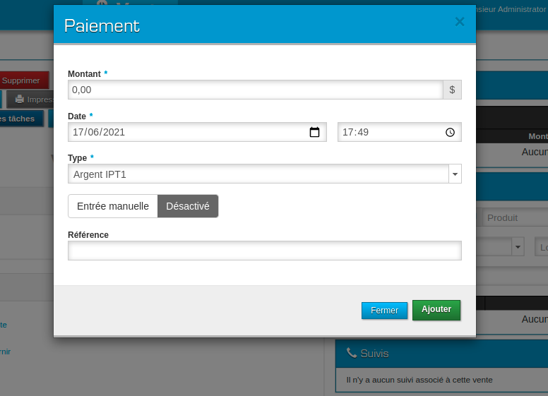 - Le bouton vert « Ajouter paiement Moneris » permet de vous laisser entrer un montant à faire payer ainsi qu’un type de paiement. Vous pouvez aussi permettre l’entrée manuelle des informations de carte à partir de cette option, et entrer un numéro de référence.