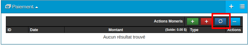 Étape #6 : Dans le cas où la transaction se fait de façon asynchrone, le système n’attend pas pour recevoir la réponse du terminal Moneris. Donc, pour voir le paiement, vous devez rafraîchir la liste de paiements pour demander au système de vous donner le paiement qui a été enregistré suite à la transaction avec le terminal.