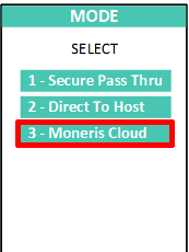 Étape #6 : Vous devriez ensuite arriver sur l’écan « MODE » avec trois autres options : « Secure Pass Thru », « Direct To Host » et « Moneris Cloud ».