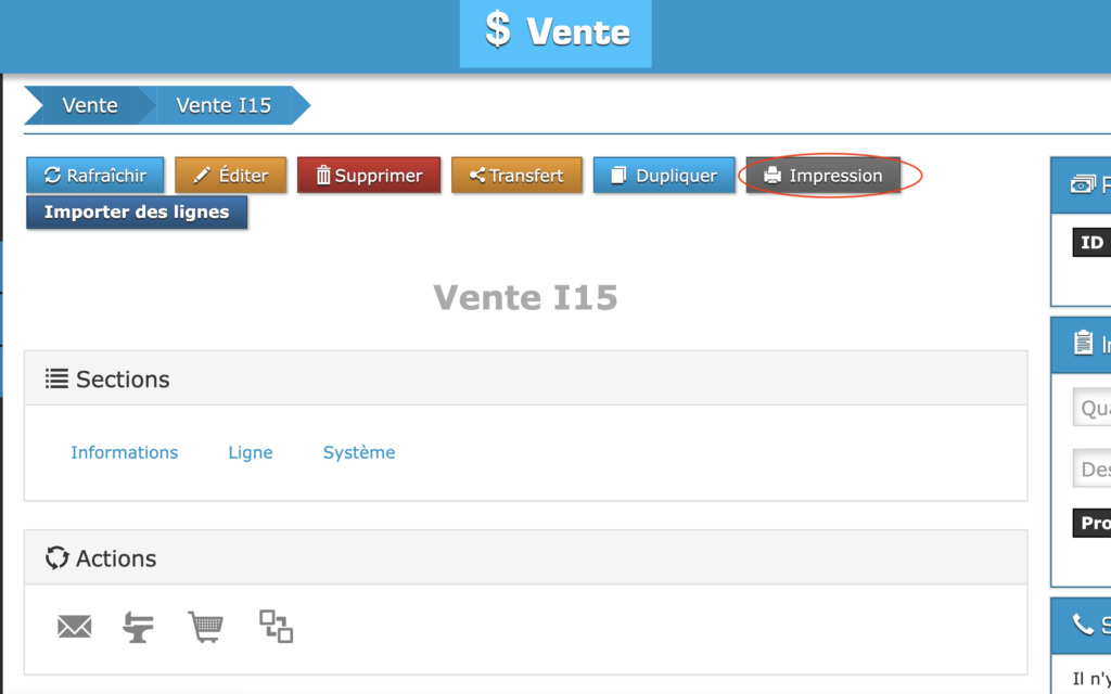 Lorsque vous aurez atteint la page de la vente à imprimer, cliquez sur le bouton gris « Impression » qui se trouve au haut de la page.