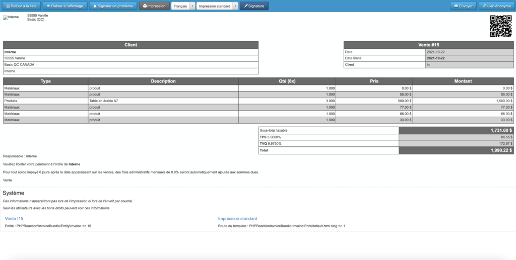 Le logiciel PHPReaction vous proposera un format d’impression. Vous aurez l’option de changer la langue et les paramètres de l’impression. Vous pourrez également envoyer le document par courriel, et même, ajouter une signature. Lorsque vous aurez décidé des réglages qui vous conviennent, cliquez de nouveau sur « Impression ».