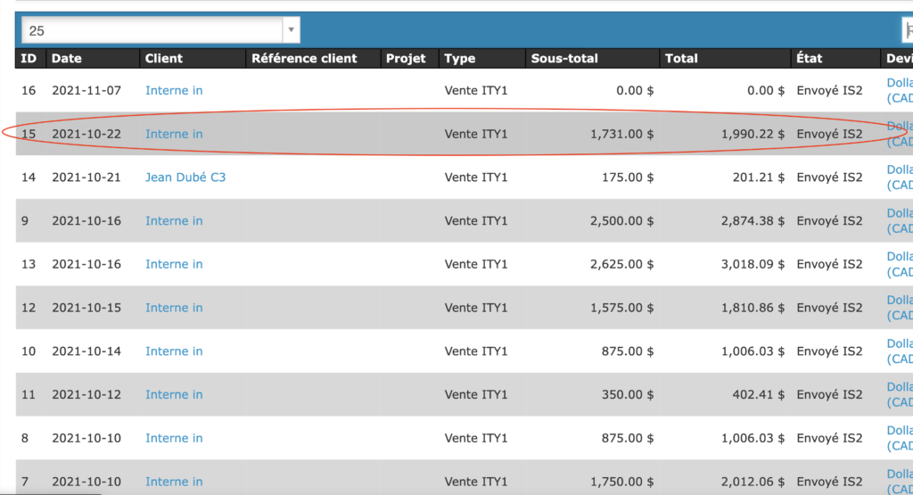 À partir de la page des ventes, consultez la liste des ventes et sélectionnez la vente pour laquelle vous souhaitez ajouter des frais d’administration. Vous pouvez simplifier votre recherche en utilisant l’option de recherche rapide, ou encore, les filtres de recherche avancée.