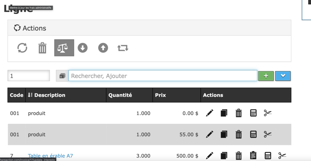 L’action de mettre à jour les frais d’administration permet à l’utilisateur du logiciel PHPReaction d’ajouter une ligne de vente à un client en retard sur un paiement. Par exemple, si des frais de 2% sont applicables à tous les 30 jours, l’utilisateur pourra ajouter ces frais à la facture du client en un seul clic. Les frais d’administration sont ajoutés avant les taxes et agissent à titre d’incitatif pour pousser le client à payer plus rapidement.