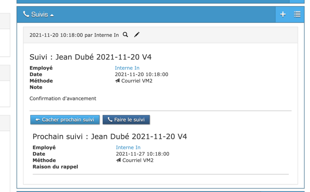 Lorsque vous aurez complété l’étape ultérieure, le logiciel PHPReaction affichera le prochain suivi. Pour retourner au suivi le plus récent, cliquez sur « Cacher le prochain suivi ».