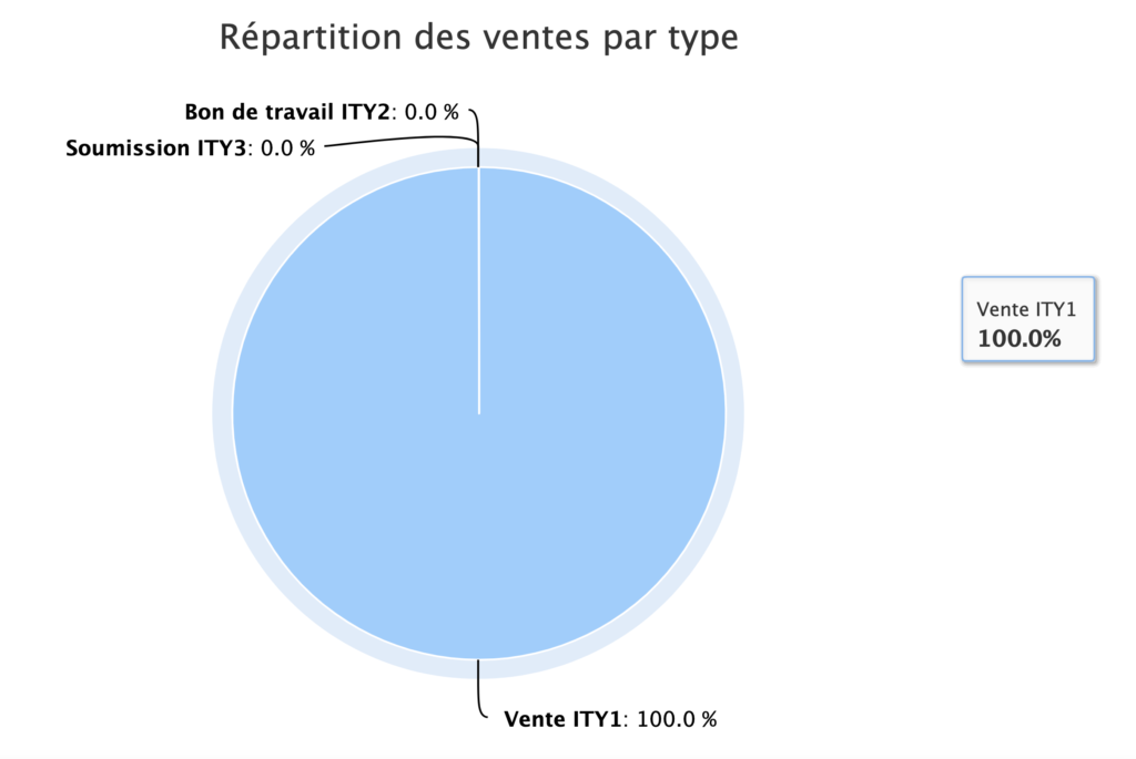 Le diagramme circulaire permet de voir la répartition de chaque type de vente en fonction du chiffre d’affaires.