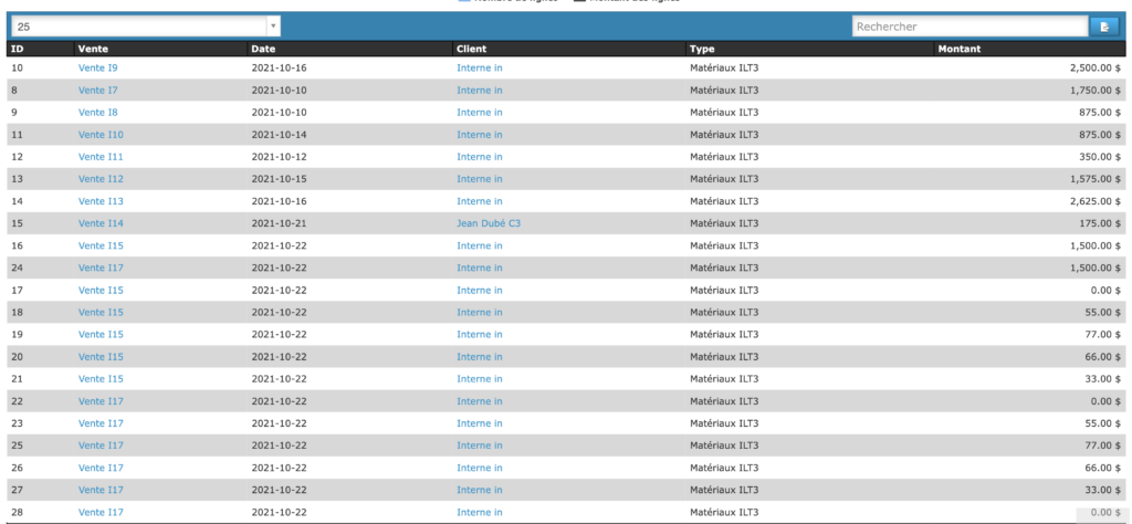 La liste déroulante affiche toutes les lignes de vente enregistrée au logiciel PHPReaction sur une période définie.