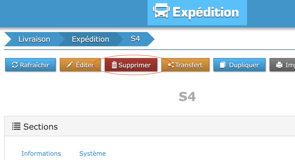 Lorsque la page de l’expédition en question s’affichera à l’écran, cliquez sur le bouton rouge « Supprimer » qui se trouve au haut de la page.