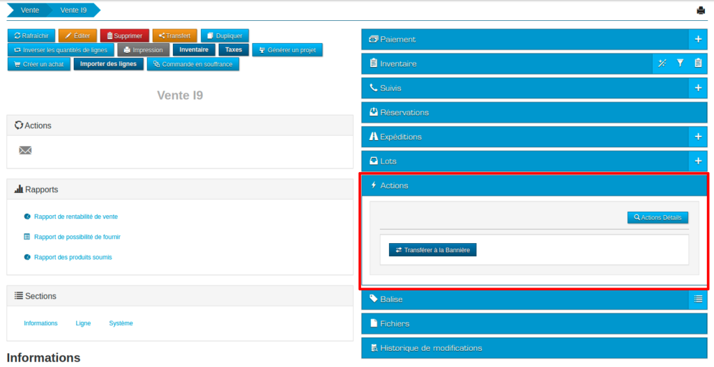- Pour transférer une vente à la Bannière, il faut aller dans la page de la vente que l’on souhaite transférer.
