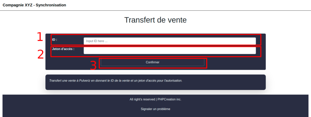 Vous arrivez à la page d’un formulaire à remplir pour effectuer le transfert d’une vente. Il y a deux champs à remplir.