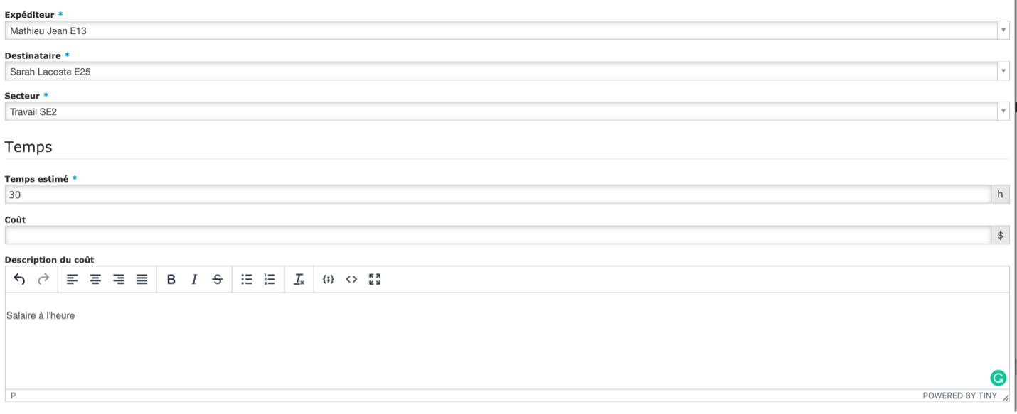 Par la suite, Mathieu enregistre les délégués (expéditeur et destinataire). Il se désigne comme expéditeur puisqu’il est l’individu qui a ajouté la tâche. Il désigne Sarah comme destinataire puisqu’elle est responsable du design des meubles. Ensuite, il ajoute le temps estimé.