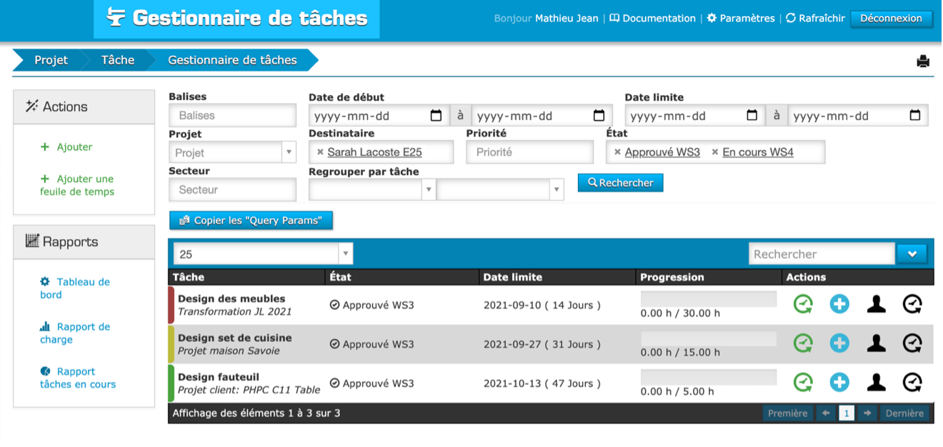 Voici ce que Sarah voit lorsqu’elle consulte le gestionnaire de tâches du logiciel PHPReaction :