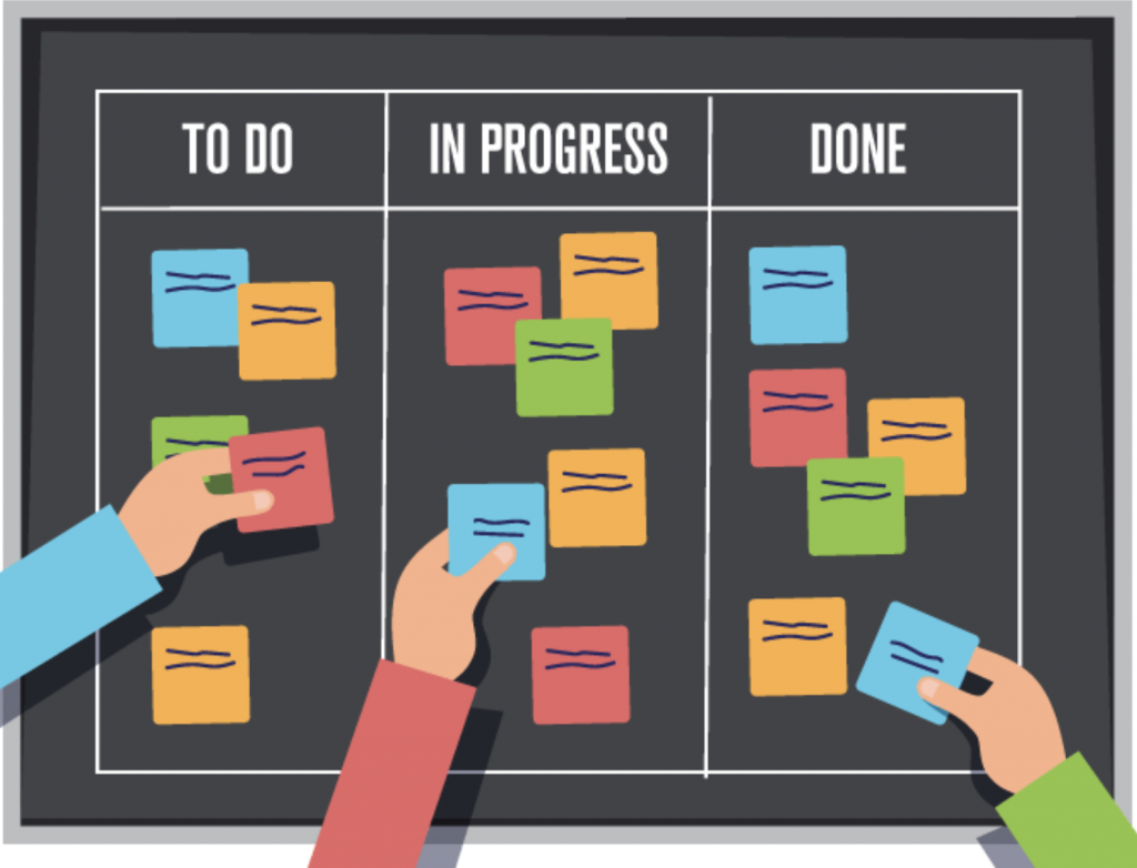 Chaque carte est associée à une tâche de travail. Ces cartes sont affichées sur un tableau, souvent divisé en 3 parties :