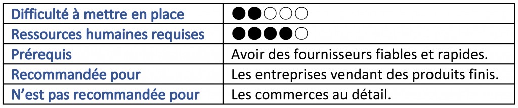 La stratégie zéro inventaire est de loin la plus efficace et la plus sécuritaire. Or, elle requiert discipline et organisation. Pour que cette stratégie fonctionne, il faut avoir des fournisseurs rapides. Dès qu’un client passe une commande, les fournisseurs doivent être en mesure d’approvisionner rapidement les stocks nécessaires pour la fabrication de la commande. En somme, l’entreprise commande les stocks dont elle a besoin en fonction des commandes de ses clients.