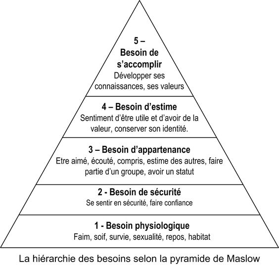 Tous les individus sur terre ont des besoins à combler. En comprenant les besoins de leurs employés, les gestionnaires se dotent de moyens pour mieux motiver leurs équipes. La pyramide de Maslow facilite l’étude des besoins des individus. Cette théorie divise les besoins en 5 catégories : les besoins physiologiques, de sécurité, d’appartenance, de confiance et d’accomplissement. Cette théorie peut être transposée pour le milieu des affaires de la manière suivante :