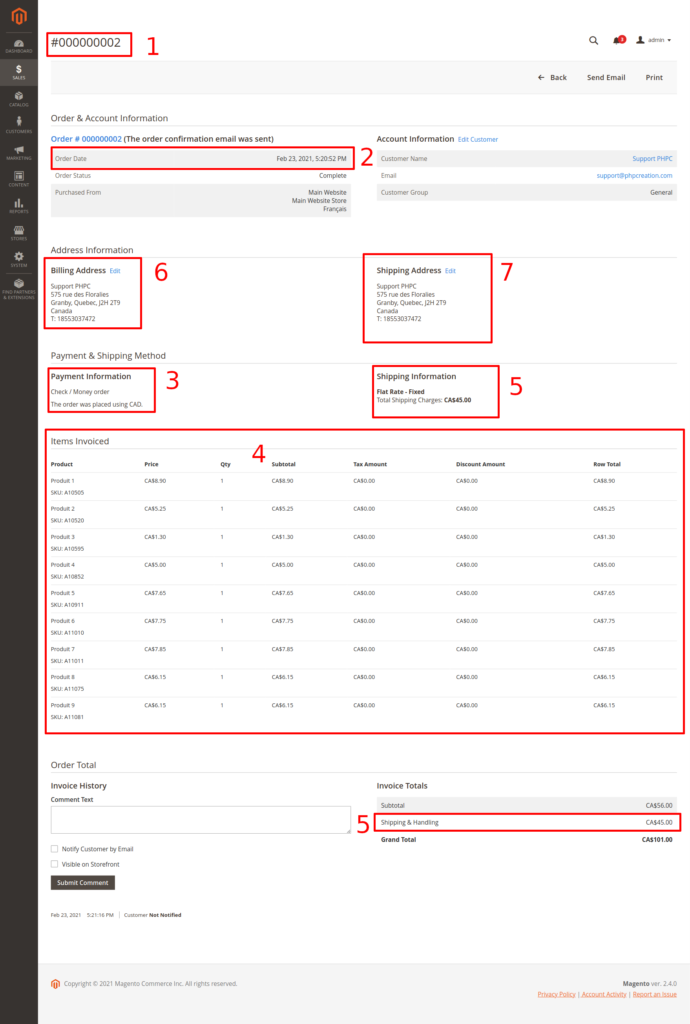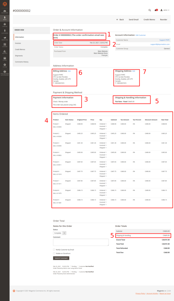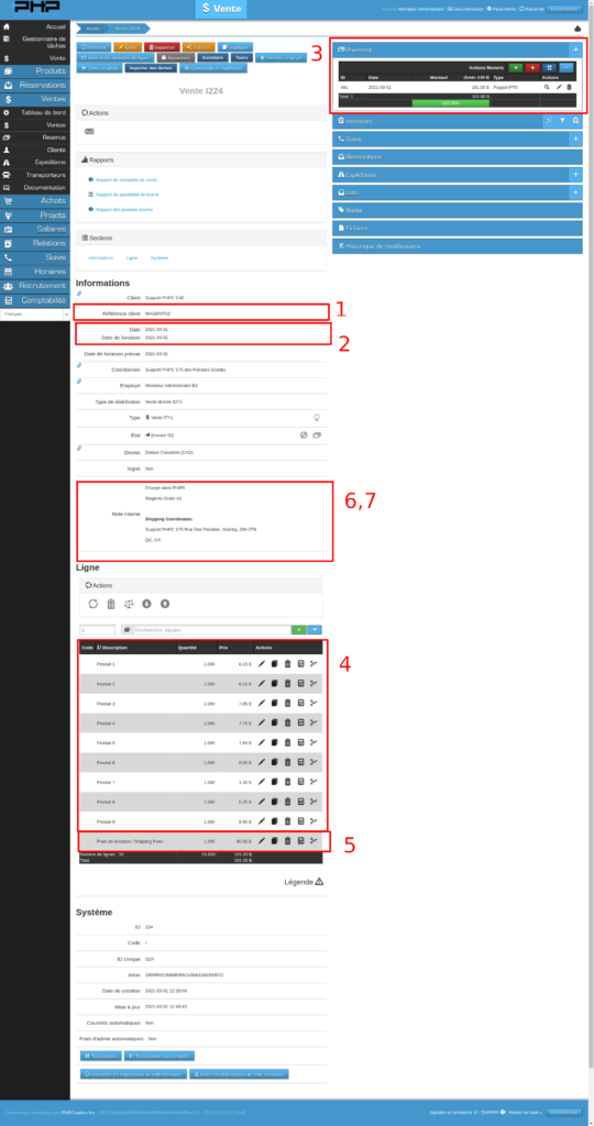 Veuillez noter que les coordonnées de facturation et de livraison intactes provenant de la vente Magento2 sont transférées dans les notes de la facture de la vente PHPReaction afin de pouvoir y avoir accès et de pouvoir confirmer les adresses lors de l’impression de la facture et de la livraison de la commande.