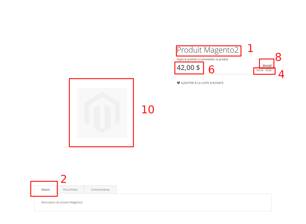 Ci-dessous, vous trouverez les correspondances de propriétés des produits entre la plateforme PHPReaction, l’interface d’administrateur de Magento2, et l’interface utilisateur visible sur le site web.