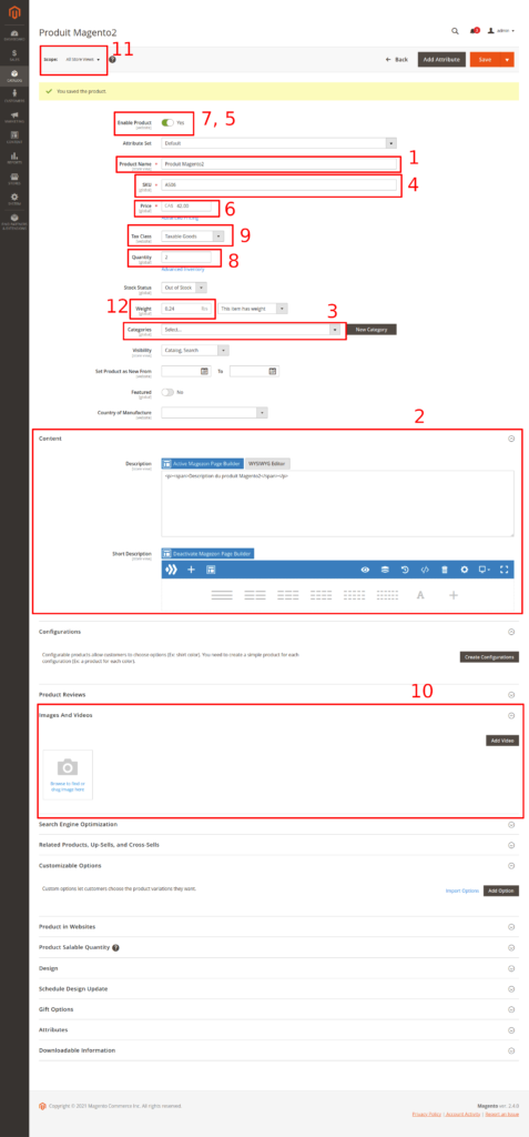 11. Traduction en anglais pour le nom et la description du produit. (Dans Magento2, simplement modifier le produit dans le store « EN » et mettre en anglais)