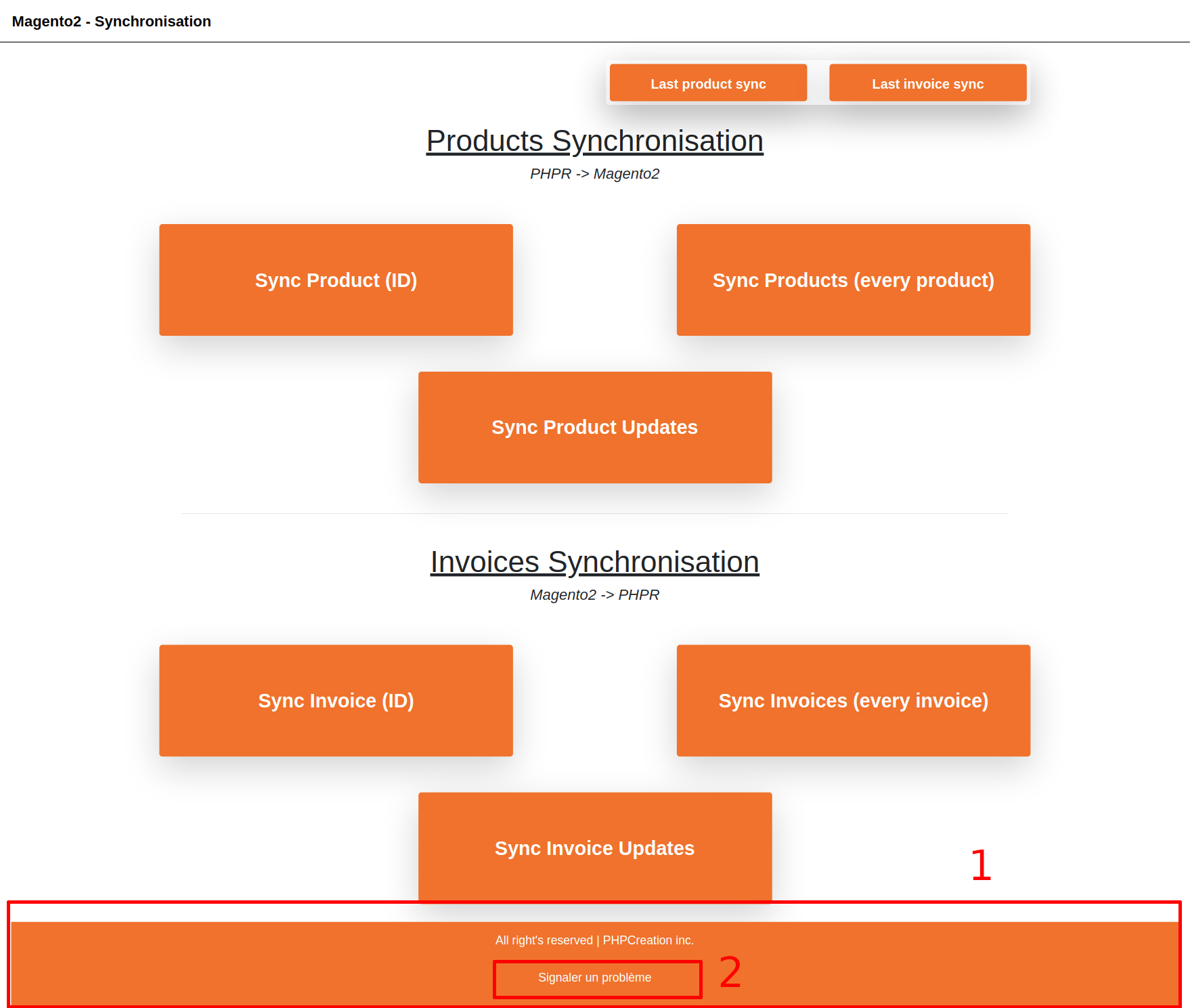 En cas de problématique dans synchronisation, ou même que vous souhaitez simplement faire un changement ou une amélioration dans la synchronisation, il est possible de faire un signalement dans le bas de la page du logiciel de synchornisation Magento2. Veuillez noter par contre qu’en cas de demande d’améliorations ou de changements, des frais peuvent s’appliquer pour le temps de travail de notre équipe.